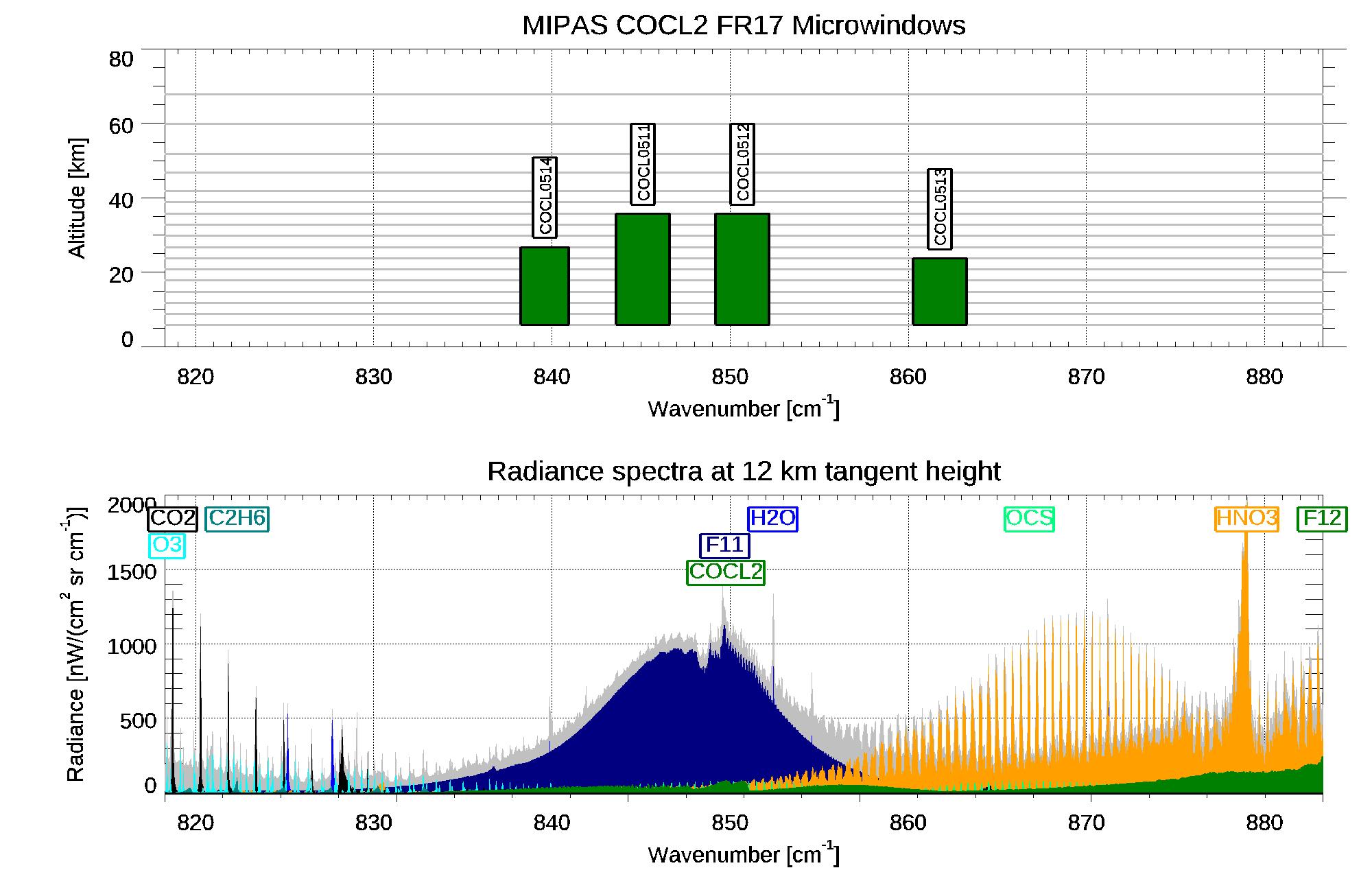 | F11 H2O HNO3 O3 OCS CO2 COCL2 N2O5 C2H6 NO2 CLO F114 F22 PAN NH3