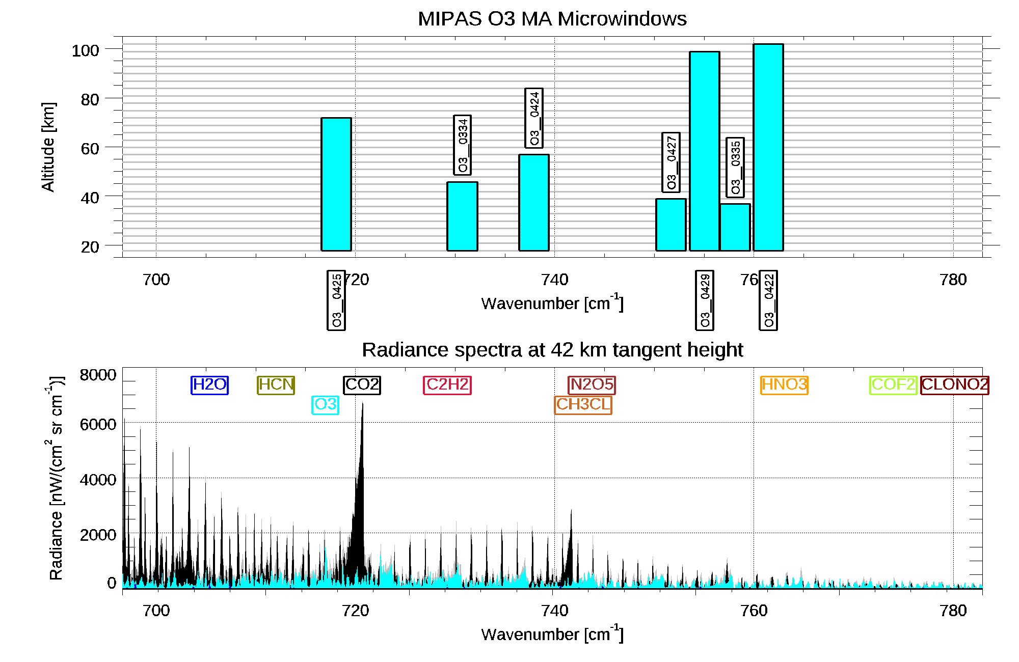 | H2O CO2 O3 C2H2 HCN CLONO2 CCL4 HNO3 NH3 N2O5 NO2 COF2 CH3CL C2H6 PAN