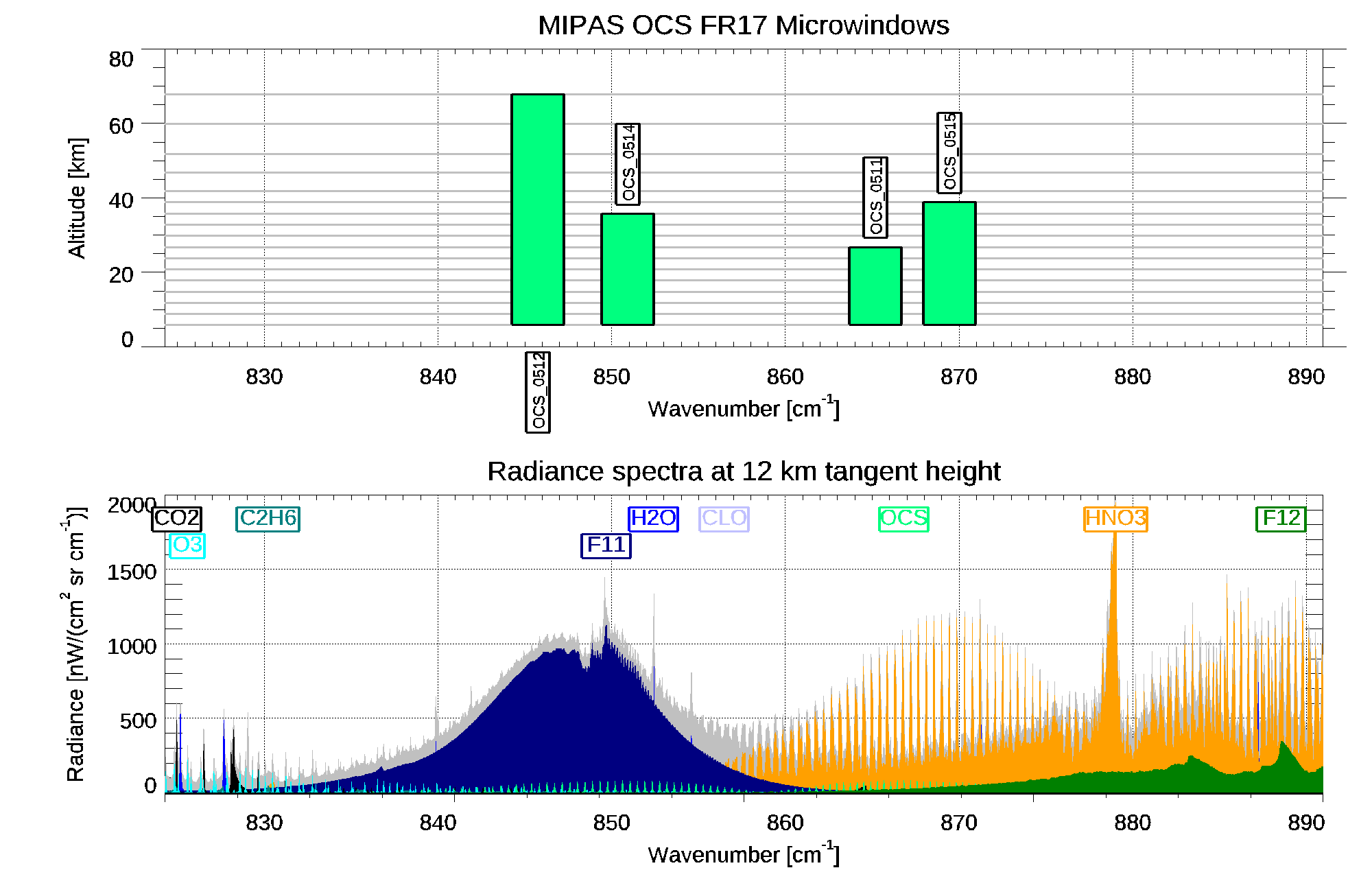 | OCS_0512 | 844.2750 | 847.2750 | 6.0 | 68.0 | H2O F11 CO2 HNO3 NH3 O3 OCS C2H6 COCL2 F114 F22 N2O5 PAN CLO NO2 |