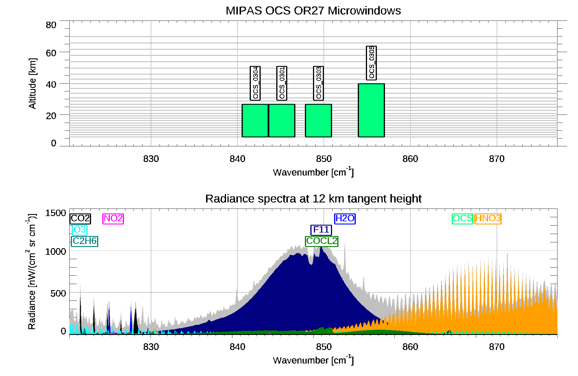 | OCS_0304 | 840.5625 | 843.5625 | 6.0 | 27.0 | H2O F11 CO2 HNO3 O3 C2H6 OCS COCL2 F22 F114 PAN N2O5 NO2 NH3 CLO |