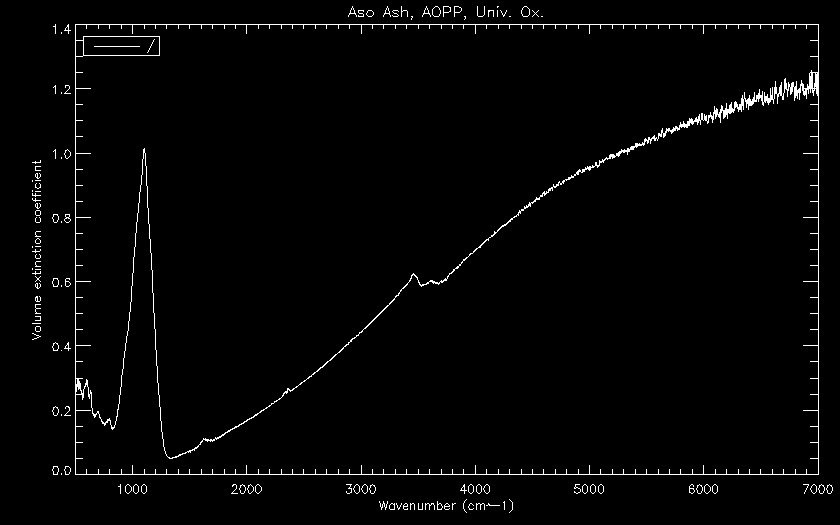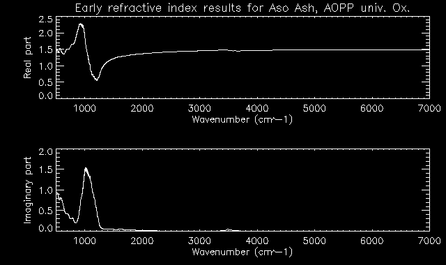 The sample used is a volcanic ash sample, collected from the Aso volcanic eruptions in 1993. This sample has been collected from a bomb-shelter where 1 m to 2 m of ash accumulated, and is hence in as fresh a state as possible. Once dispersed into the MSF aerosol cell, we obtained an absorption spectra. An example is given in Fig. 1. On applying the method of Thomas 2005 the refractive index and particle size distribution was obtained. And example of the refractive index derived in shown in Fig. 2. Future workThe above spectra will be applied to remote satellite retrievals of ash clouds, and early results are promising. Ideally we would also repeat these experiments for a number of different volcanic eruptions as the spectral signature will change as the chemical composition of the ash for each eruption is different. We would like to extend the measurements into the visible and ultra-violet as this would be of great use for instruments such as lidar. With the latest Icelandic eruption of Eyjafjallajökull and disruption air transport there is clearly a need to improve the detection and quantification of volcanic ash clouds.Links and referencesCasadevall, T.J. (Ed.), Introduction to Volcanic Ash And Aviation Safety, Proceedings of the 1st International Symposium on Volcanic Ash and Aviation Safety, USGS Bulletin 2047, 1994. Irshad R., R.G. Grainger, D.M. Peters, R.A. McPheat, K.M. Smith, G.E. Thomas, Laboratory measurements of the optical properties of sea salt aerosol, Atmos. Chem. Phys., 9(1),221-230, 2009. Thomas, G. E.; Bass, S. F.; Grainger, R. G. & Lambert, A. Retrieval of aerosol refractive index from extinction spectra with a damped harmonic-oscillator band model APPLIED OPTICS, 2005 Please contact us before reproducing these images elsewhere, or if you have further questions. |
