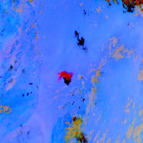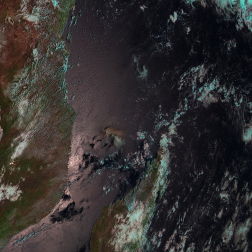 VOLCANIC EMISSION FROM SATELLITECASE STUDY: 25 Nov 2005 - Karthala (Ash and So2)SEVIRI IMAGES (6:12-15:42 UTC)Volcanic eruption affect the signal in both spectral range, visible, near_infrared and thermal infrared region.SEVIRI allow us to follow the event with a time resolution of 15min. Here the foulse colore images prodice with the SEVIRI channels in the two spectral regions: thermal infrared and visible/near_infrared.