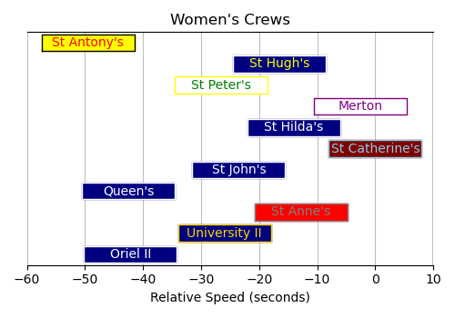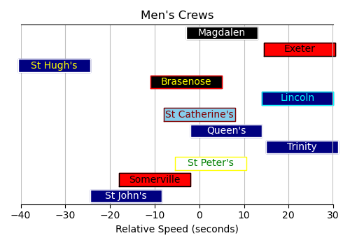 Oriel men were the fastest crew on the day, but they only beat Wolfson by 1.5 s, not enough to regain the Headship. Hertford were 3rd fastest and can only dream of the happy times they would have had working their way up from the bottom of Div I. No argument about the women's Headship, though. Pembroke, the head crew, were also the fastest in TorpHeads, 6.5 s ahead of 3rd place Univ but 47 s ahead of 2nd place Christ Church, who suffered the indignity of being overtaken (although definitely not bumped) by Univ. We can also use the results for some informed speculation on how our own crews might have fared. Below are plots of the speeds of the crews that started around our 1st VIIIs (further to the right means faster). It should be noted that neither Worcester nor S.E.H., the two crews immediately behind the men's 1st Torpid, chose to race, and neither did Linacre or Wolfson II women, the crews 2 and 3 places behind the women's 1st Torpid. This suggests that the men were very much in the middle of the local pack. Taking 5 s difference as the minimum required for a bump, it seems that even if Catz men managed to evade Queen's over the week they would almost certainly have been caught by Trinity by the second day. If they kept their heads they might have limited their losses 1 or 2 places but with a chance of a bump on St Hugh's later in the week. The women were the fastest boat in their locale and looked well set up for a successful week: probably bumping St Hilda's on the first day, St Peter's on the 2nd and St Antony's at some point (I've had to add 30 seconds to St Antony's speed just to keep them on the same plot). But let's not get ahead of ourselves; time trials are no substitute for actual bumps racing. |