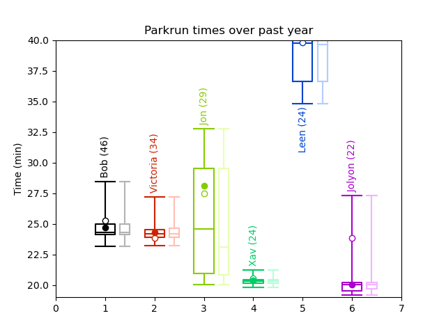 Solid bars indicate fastest, median, slowest times and the box covers the middle 50% percentile. Solid circles are the latest run, open circles the previous run. Lighter symbols to the right shows results excluding the last 4 runs, i.e. indicating how these have changed over the last 4 runs.