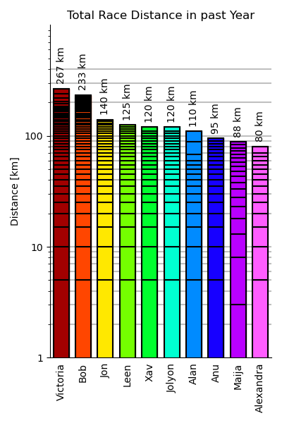 Cumulative Distance [Prev] for formal races entered by OUCH members over the last 12 months (top 10 runners, by total race distance, only).